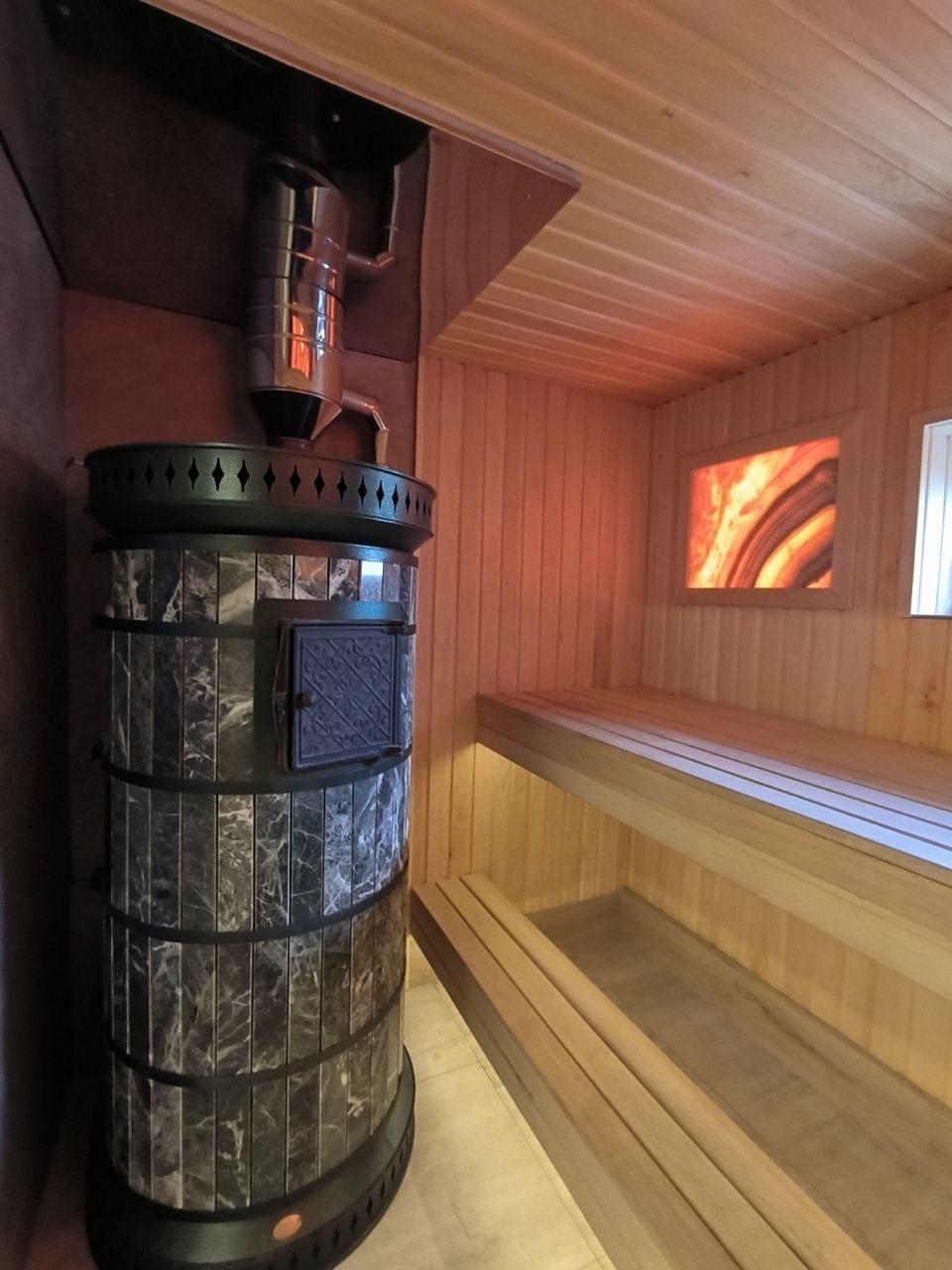 Даёт эффект русской парной, мягкое излучение, вмещает 160 кг камней