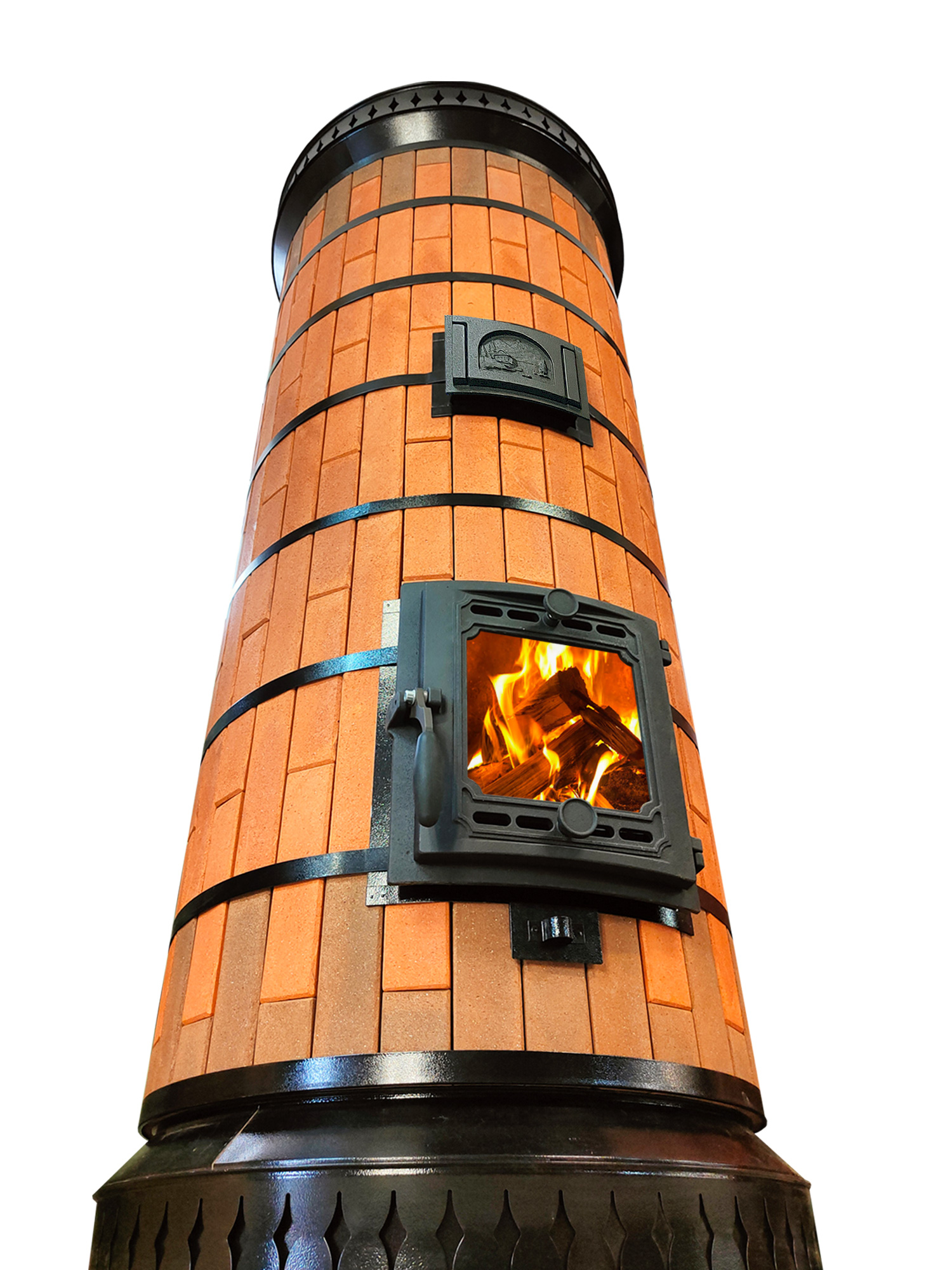 Круглая форма обеспечивает прогрев по всей поверхности печи. Основание стоит на шанцах, благодаря чему, тепло не уходит в фундамент